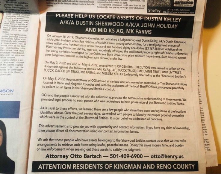 The seizures extended into 2023, with additional notices for the public auction of specific vehicles, including a 2020 GMC Sierra 2500 HD Denali and a 1972 Chevrolet C60 grain truck, levied in Kingman, Reno, and Sedgwick counties to satisfy outstanding debts. These actions, published in local papers like the Kingman Leader-Courier, highlighted Sherwood’s use of shell entities like Mid Ks Ag, LLC, and various trusts as “alter egos” to shield assets, which we will discuss shortly.